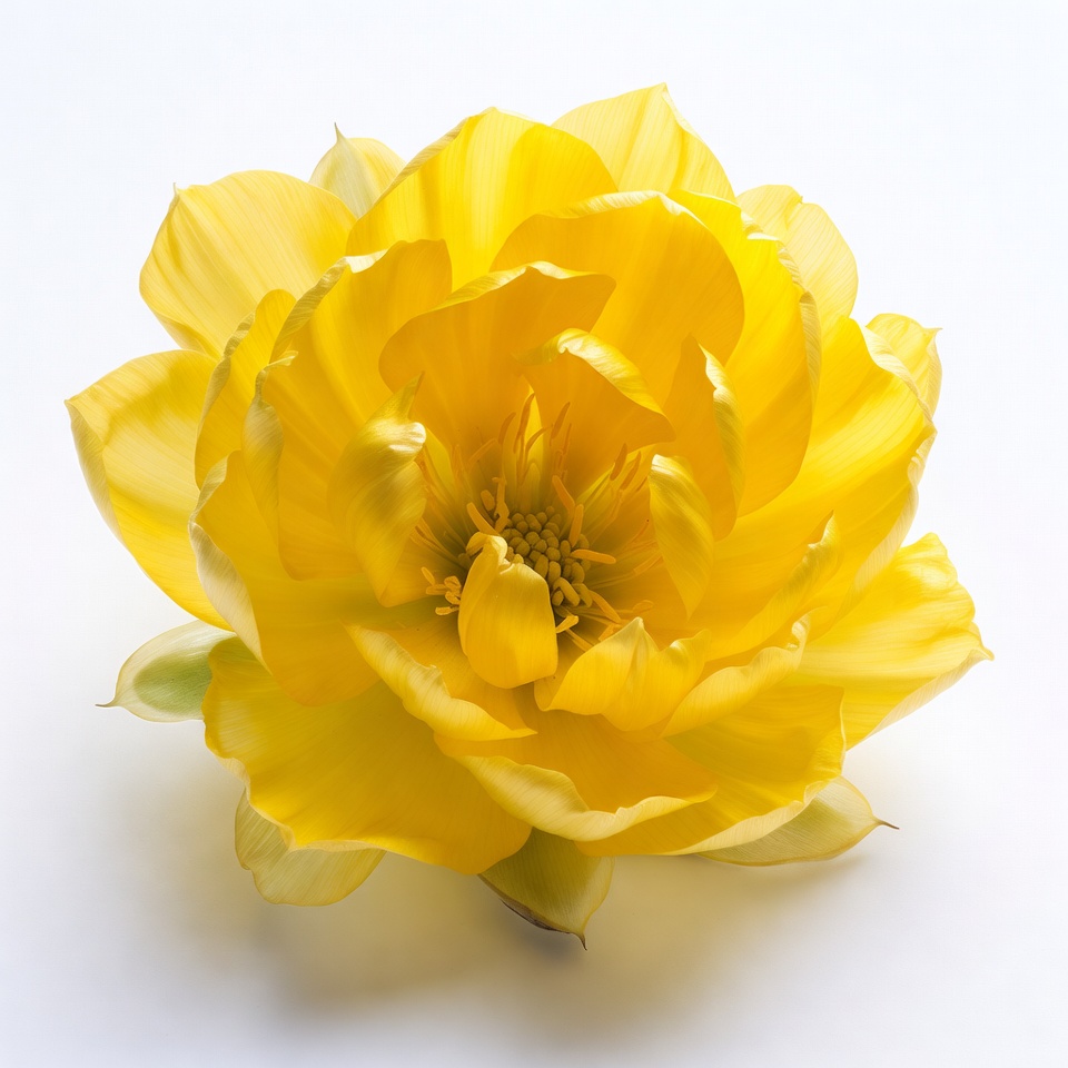 A vibrant yellow dahlia flower with layered petals is centered against a plain white background. The petals display varying shades of yellow with subtle green sepals at the base. The flower is in full bloom, showcasing intricate details in its ruffled edges.