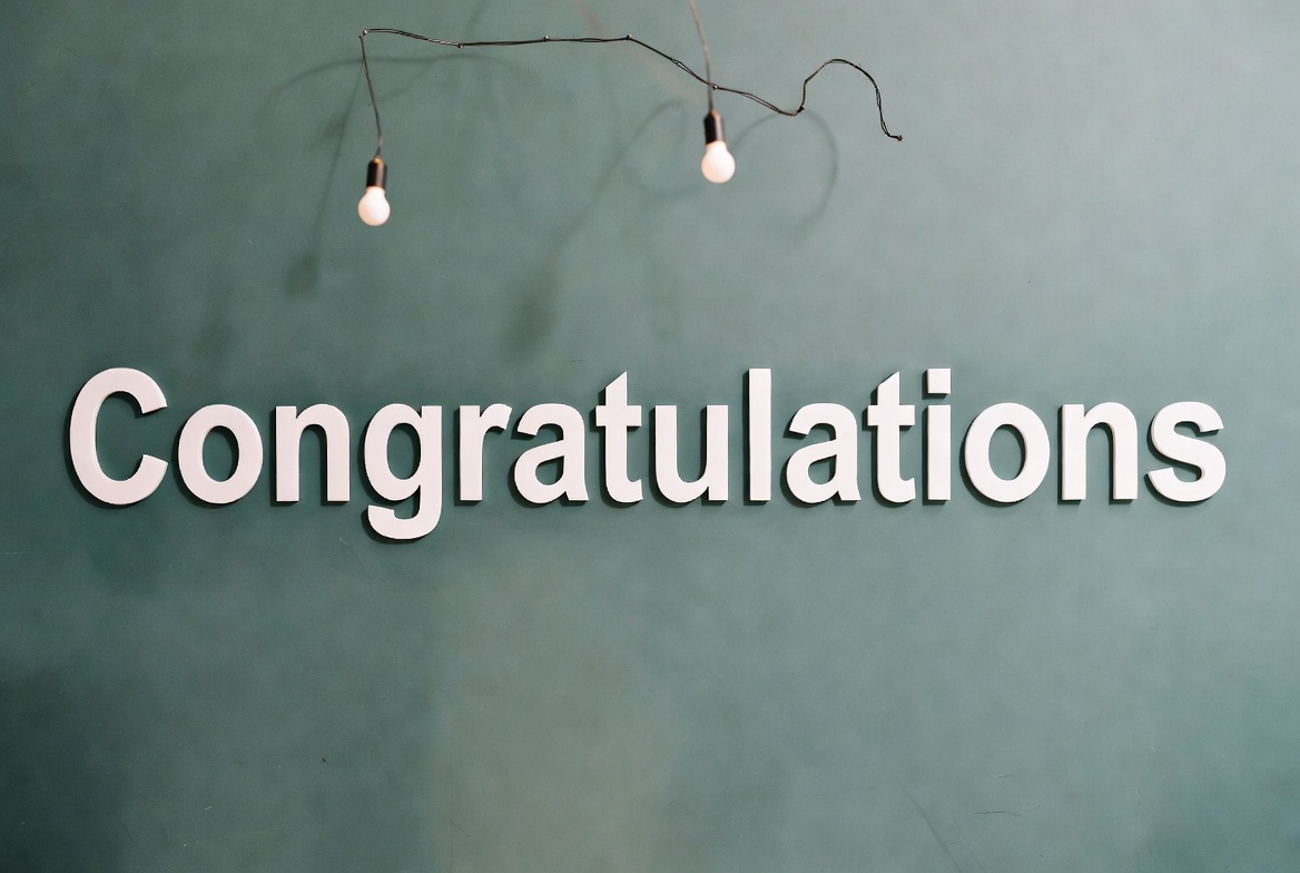 achievement, banner, celebration, decor, event, gradient, graphic, hanging bulbs, isolated background, light bulbs, minimalist, modern, party, sign, teal wall, text, typography, wall art, white letters, congratulations