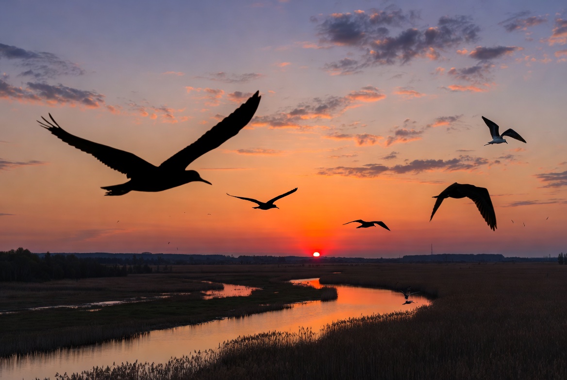 Multiple birds fly in dark silhouettes against a vibrant orange and purple sunset sky. A calm river winds through golden marsh grasses in the foreground, reflecting the sun's glow. The scene captures the birds soaring gracefully over the wetland landscape.