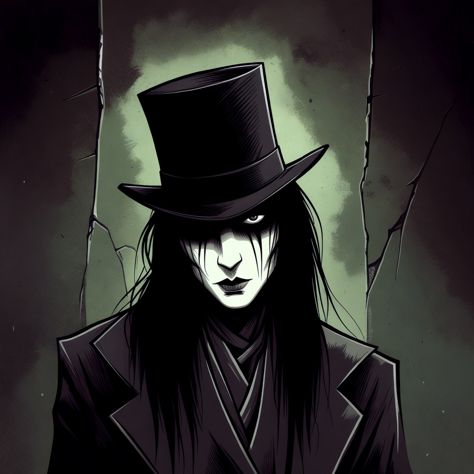 A gothic illustration of a pale man with long black hair and black eyeliner stands in a dark, cracked frame. He wears a tall black top hat, a high-collared black coat, and a scarf. The background is shadowy green with ominous cracks.