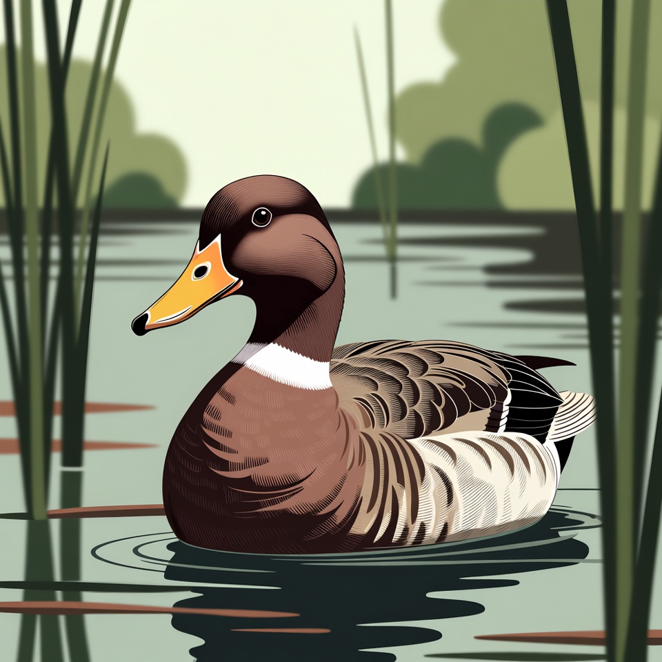 A detailed illustration of a male mallard duck swimming in calm water surrounded by tall green reeds. The duck features a glossy brown head, bright yellow bill, white neck collar, and brown-gray feathers with black tail. Subtle green background vegetation frames the scene.