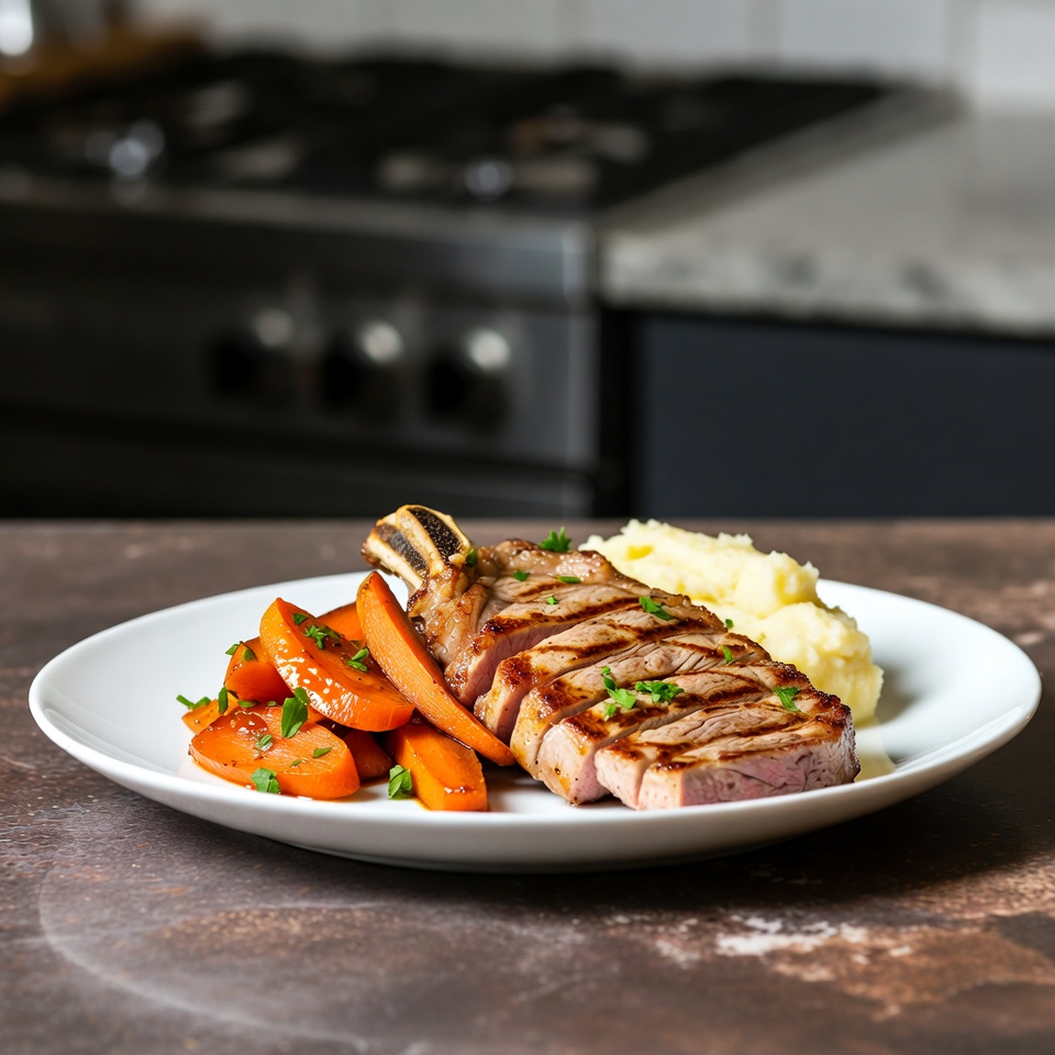 baby carrots, creamy mash, dinner plate, food photography, food plating, gourmet meal, grilled pork, kitchen background, mashed potatoes, meat dish, parsley garnish, pork rib chop, savory dish, steamed vegetables, vegetable side, white plate, wooden table, pork chop