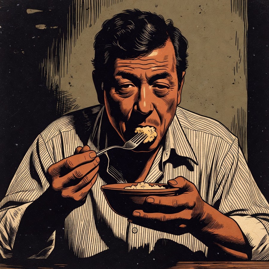 An illustration of a middle-aged man with dark hair eating rice from a bowl using a fork. He wears a light-colored striped shirt and holds the bowl with both hands. The artwork features a textured, sepia-toned style with dramatic shading.