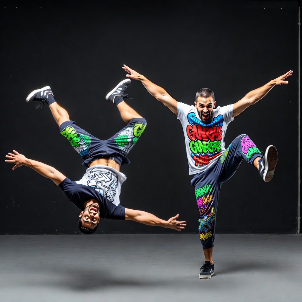 Two athletic men perform dynamic breakdance moves against a solid black background. One man is upside down in a headspin pose with legs extended, wearing neon graffiti-patterned shorts and a gray t-shirt. The other stands with arms outstretched and one leg kicked high, dressed in baggy colorful pants and a white graffiti t-shirt.