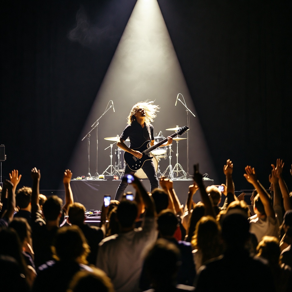 audience, black shirt, blonde hair, cheering crowd, concert stage, crowd, dark background, drums, electric guitar, energetic, female musician, hands raised, live music, live performance, long hair, microphone, musician, performing, phones, rock concert, rock music, rockstar, spotlight, stage, woman