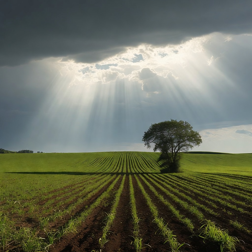 Dramatic dark storm clouds part to reveal bright sun rays beaming down on a vibrant green plowed field. A lone tree stands in the center of the cultivated farmland with neat rows of young crops. The scene features a mix of shadowy clouds and golden sunlight highlighting the landscape.