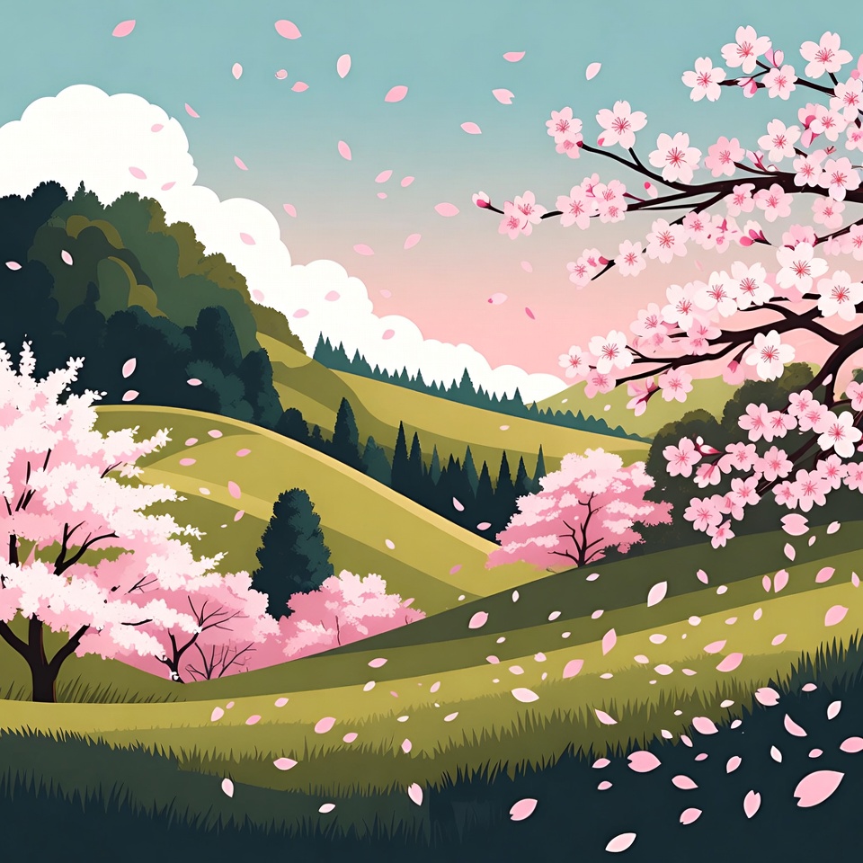 A vibrant illustration depicts rolling green hills covered in blooming pink cherry blossom trees. Petals float through the air against a sunset sky with fluffy clouds and distant mountains. The scene features a serene valley landscape in soft pastel colors.