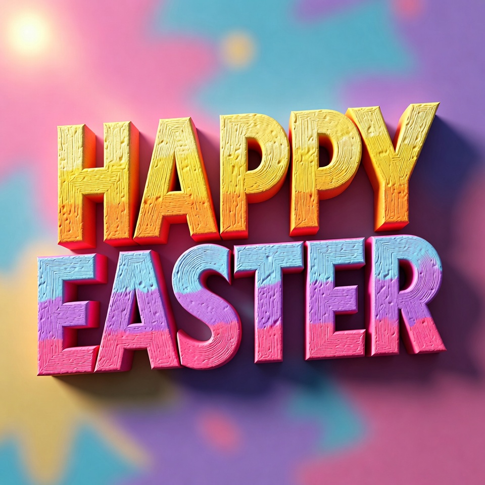 Colorful 3D block letters spelling 'Happy Easter' in vibrant yellow, orange, pink, and purple gradients. The text features a glossy, beveled style against a dreamy purple and blue gradient background with a glowing sun. The design is bold and festive with smooth shading and highlights.