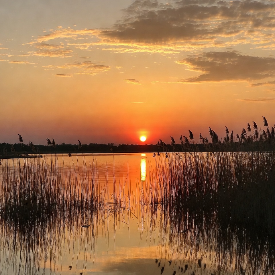 A vibrant orange sun sets over a calm lake, reflecting its golden light on the water's surface. Tall reeds and cattails line the foreground and edges of the lake. Scattered clouds enhance the warm sunset sky.