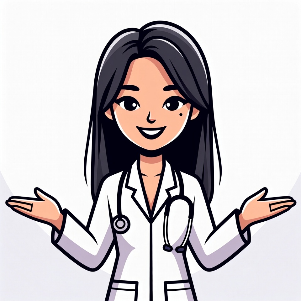 A cartoon Asian woman with long black hair wears a white lab coat and stethoscope. She stands with arms outstretched and open palms on a white isolated background. Her face shows a friendly smile with large expressive eyes.