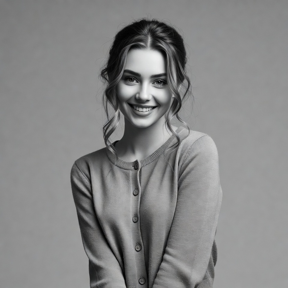 A young woman with wavy blonde hair pulled back smiles warmly at the camera. She wears a light gray button-up cardigan with a crew neck. The portrait is in black and white against a plain gray background.