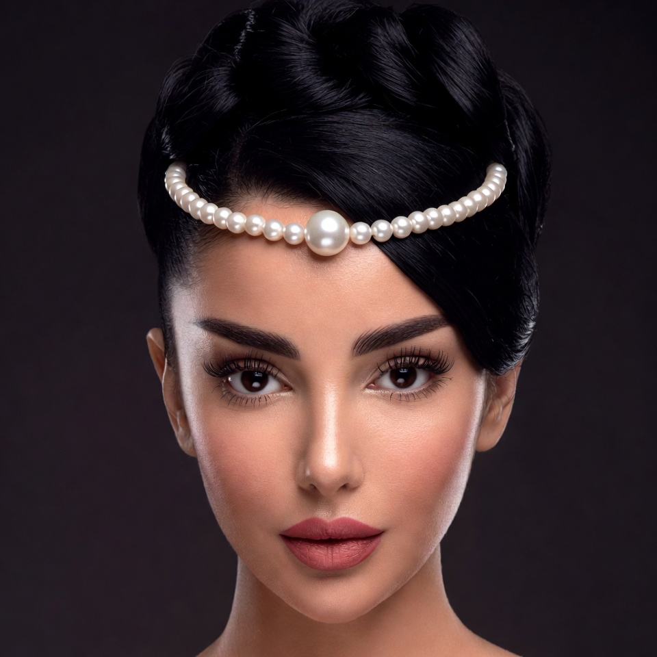 A woman with sleek black updo hairstyle wears a delicate pearl headband centered with a large pearl. Her face features bold eyeliner, long lashes, and pink lipstick on a dark background. The close-up portrait highlights her elegant facial features and glossy hair.