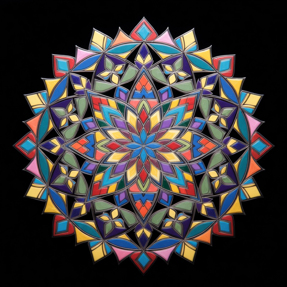 A vibrant mandala design features intricate geometric patterns in bright colors including blue, purple, yellow, orange, green, and pink. It is symmetrically arranged with diamond and petal-like shapes radiating from the center. The artwork is isolated against a solid black background.