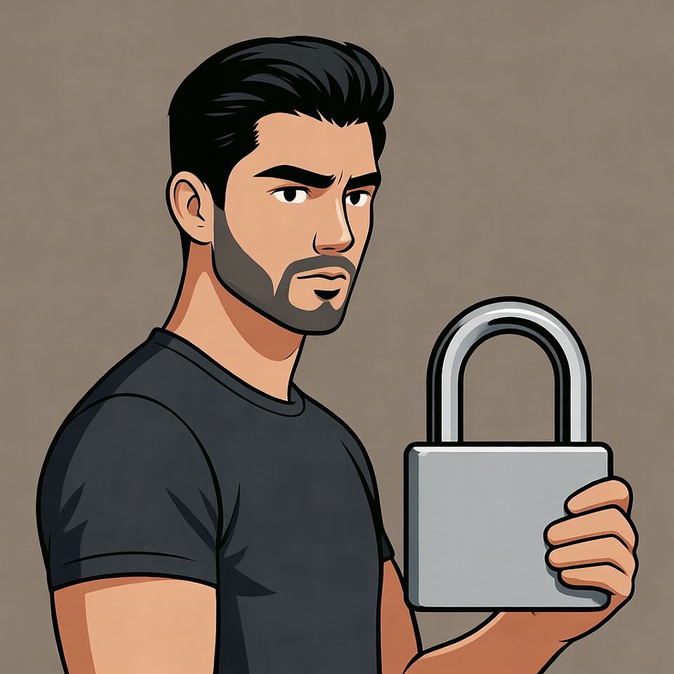 A cartoon man with short black hair and a beard wears a black t-shirt and holds a large silver padlock in his right hand. He stands against a plain beige background with a serious expression. The illustration features bold lines and vibrant shading.