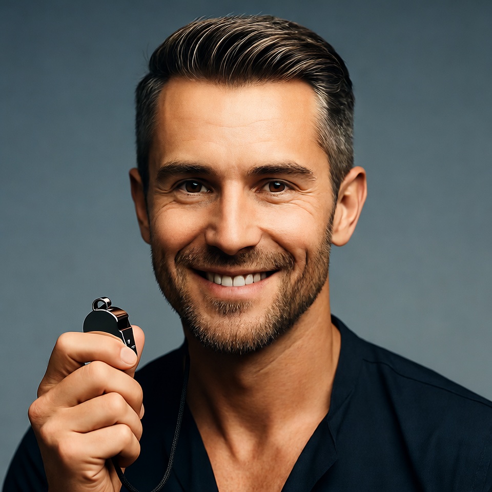 A middle-aged man with short graying hair and a trimmed beard smiles confidently at the camera. He wears a dark shirt and holds a black whistle in his right hand against a plain blue background. His expression is friendly and engaging.