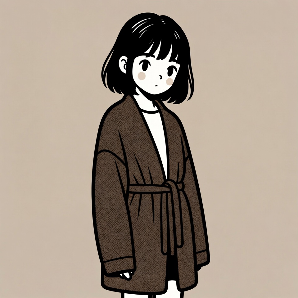A cute anime girl with short black bob hair and large expressive eyes stands on a beige background. She wears a loose brown cardigan over a white top and shorts, with hands at her sides. The illustration features clean black line art with soft beige tones.
