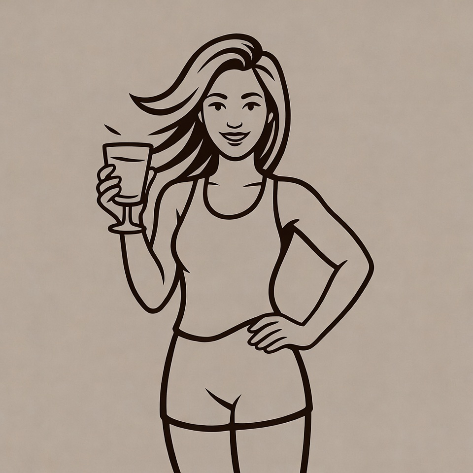 A line art illustration of a smiling Asian woman with long wavy hair holds a tall wine glass in her right hand. She wears a tank top and shorts, stands confidently with her left hand on her hip, on a beige isolated background.