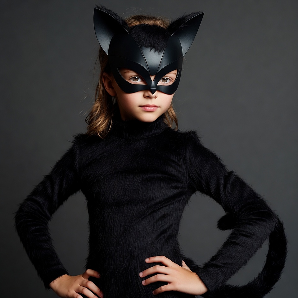 A young girl with blonde hair wears a black cat costume featuring a furry mask with cat ears and whiskers. She stands confidently with hands on hips against a dark gray background. The costume includes a black furry bodysuit and a tail.