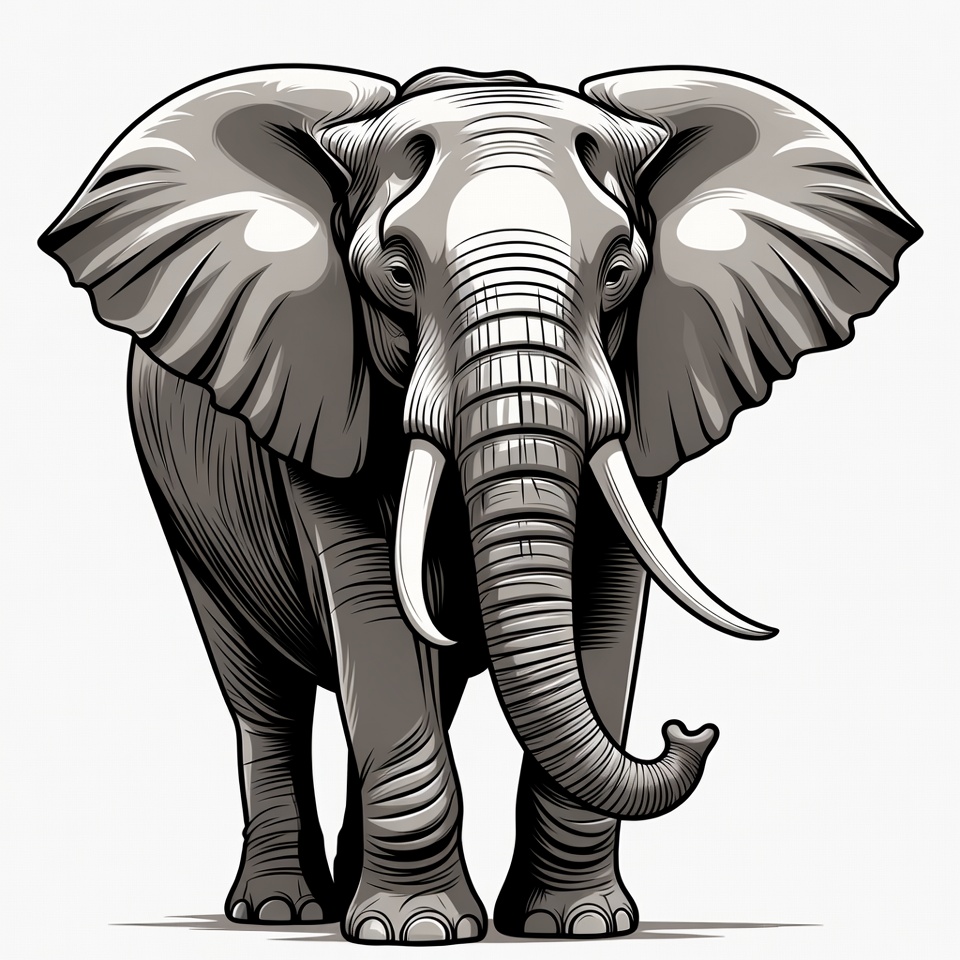 African elephant, animal, big ears, black and white, curved tusks, detailed drawing, grey elephant, illustration, isolated background, large ears, mammal, realistic illustration, safari animal, standing, trunk, tusks, wildlife, wrinkled skin, elephant