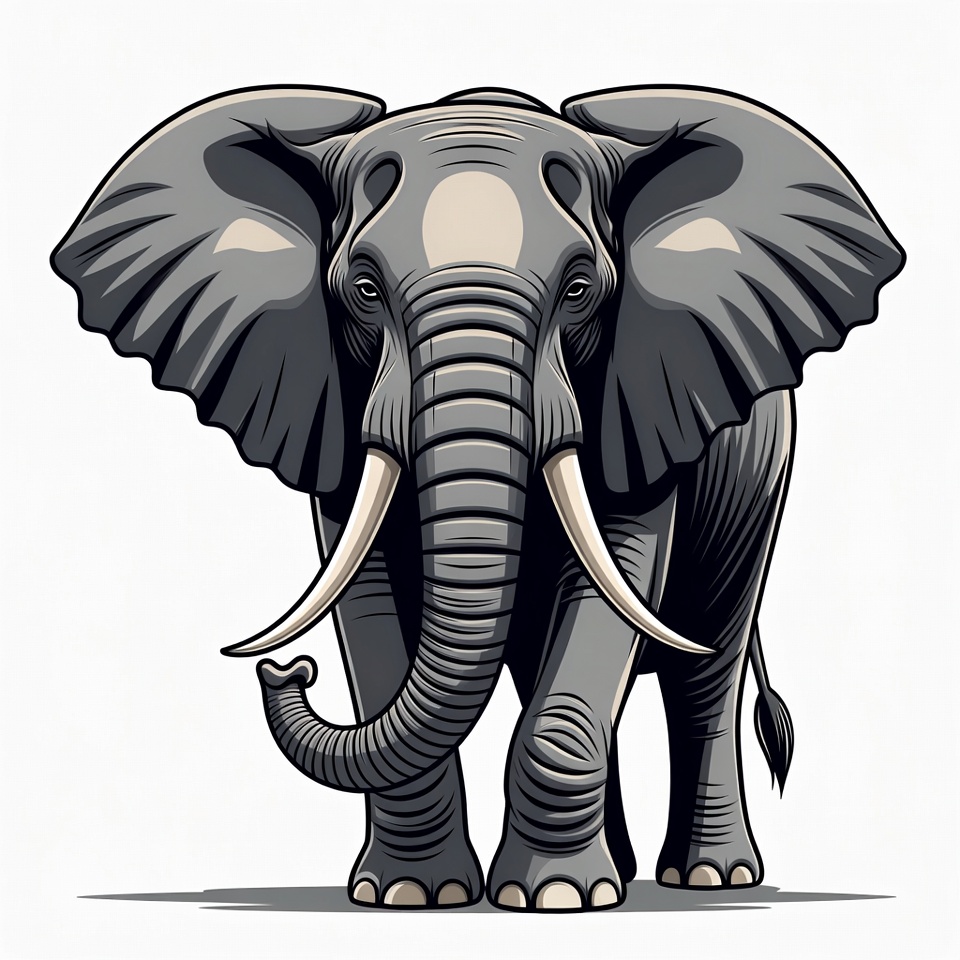 A detailed vector illustration of a large elephant with wide flapping ears and long curved tusks stands on a plain white background. The elephant's gray skin features textured shading and wrinkles, with a short trunk curled upward and sturdy legs ending in large flat feet. The image is rendered in a realistic style with bold outlines and subtle shadows.
