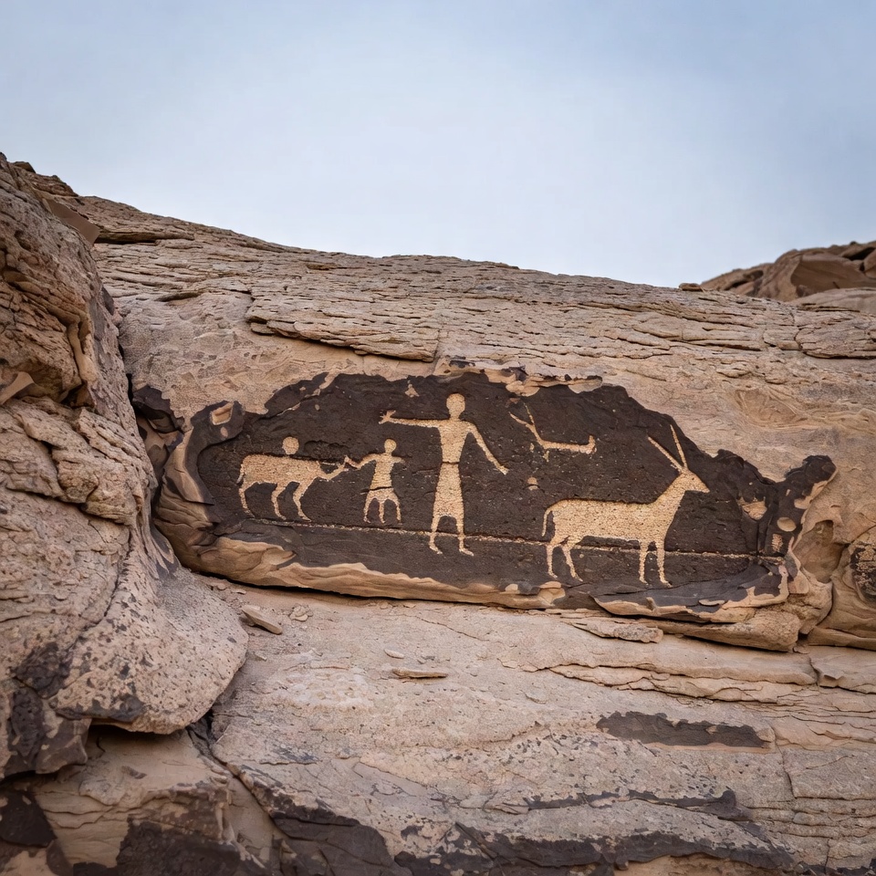 ancient carving, animals, archaeology, blue sky, boy, cave painting, child, deer, desert landscape, desert rock, family, girl, humans, illustration, isolated background, man, petroglyph, prehistoric art, sandstone cliff, stick figures, white outlines, rock art
