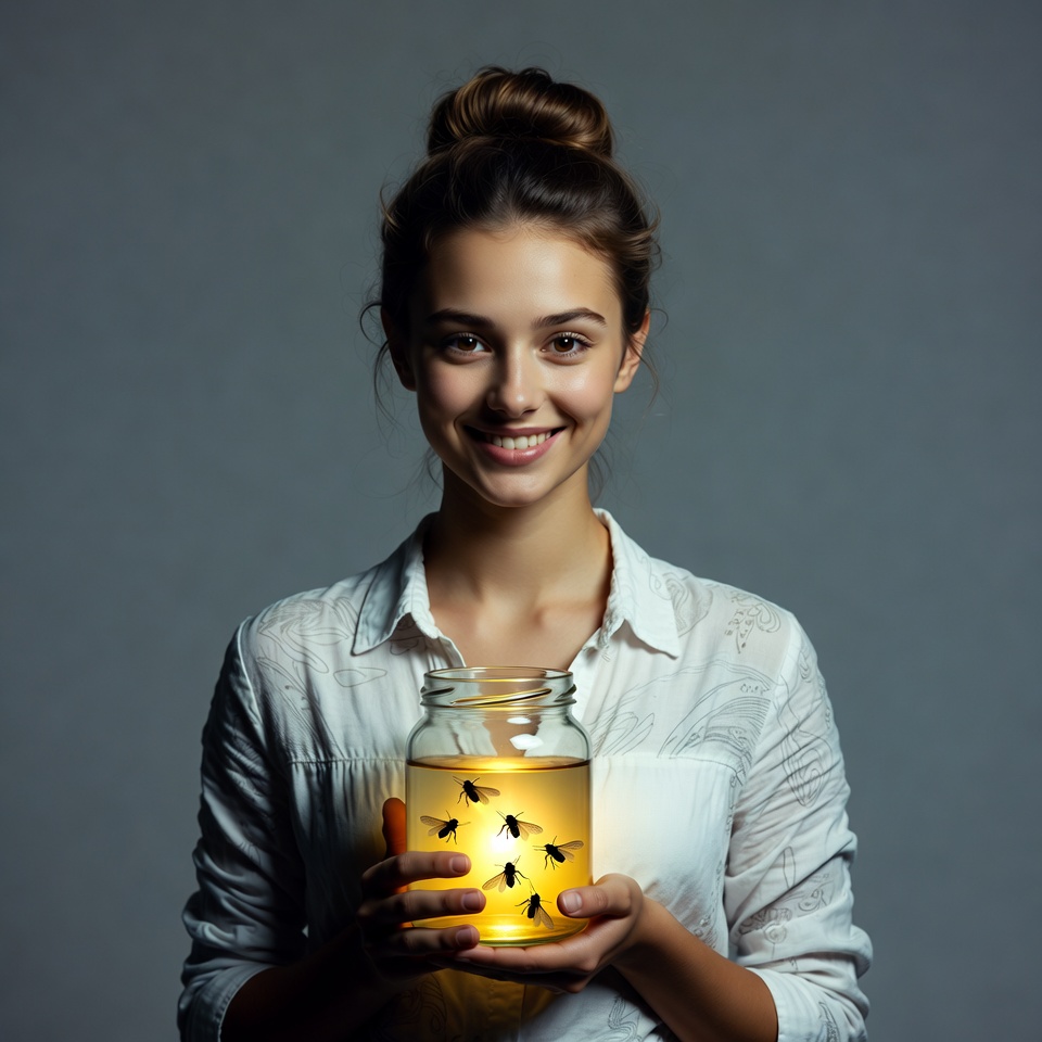 bees, brown hair, bun hairstyle, flying bees, glass jar, glowing jar, honey jar, isolated background, smiling woman, white shirt, yellow glow, young woman, woman