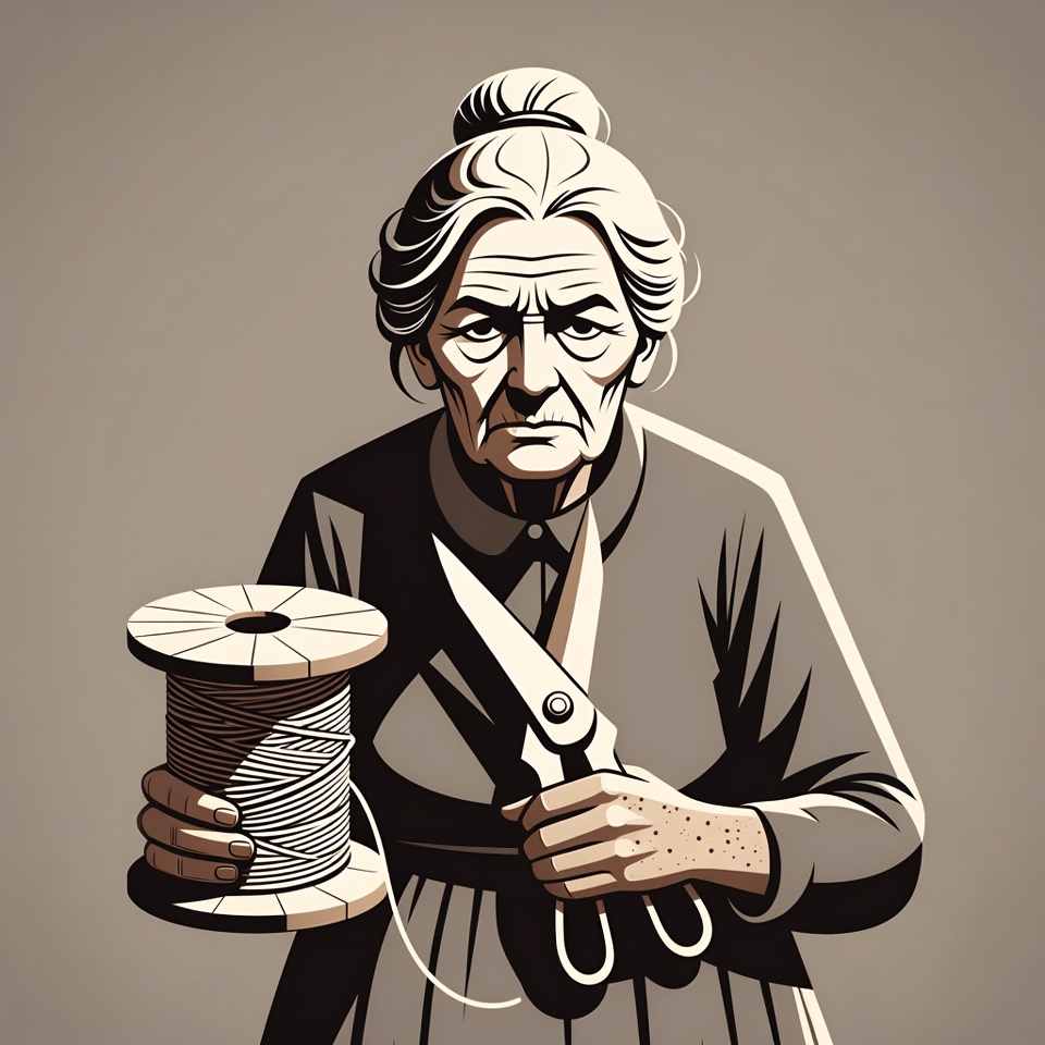 An illustration of an elderly woman with white hair in a bun stands holding a spool of thread in one hand and large scissors in the other. She wears a long dark dress with a collared shirt and has a stern expression on her face. The image features a simple isolated background in grayscale tones.
