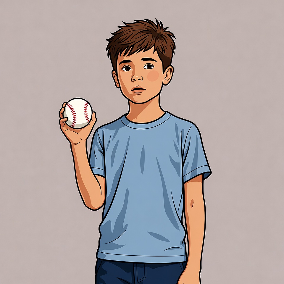 A young boy with short brown hair holds a white baseball with red stitching in his right hand. He wears a blue t-shirt and blue jeans, standing against a plain gray background. The illustration features clean lines and a cartoon style.