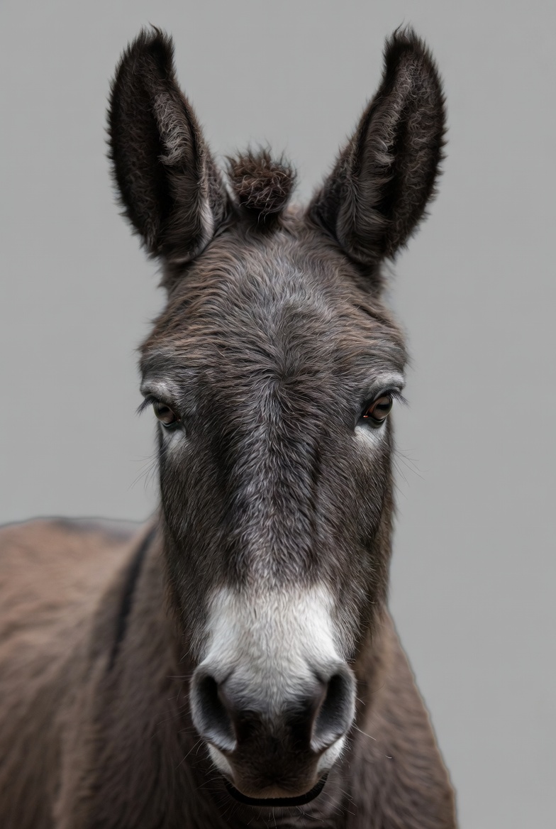 A close-up portrait of a donkey with long dark ears and a small tuft of fur on top of its head. The donkey has a white muzzle and brown fur, staring directly at the camera against a plain gray background. Its expression is calm with visible eyelashes and nostrils.