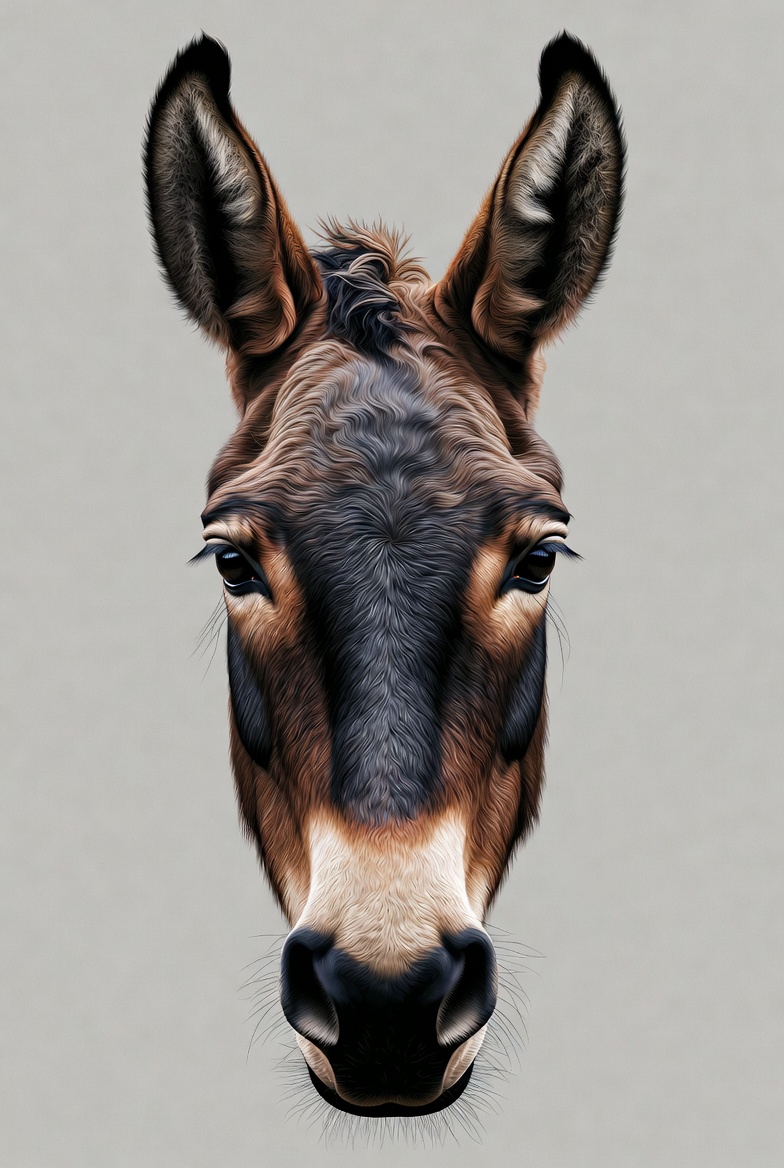 animal, brown eyes, close-up, detailed, ears, equine, face, fur, gray background, headshot, illustration, isolated background, mammal, muzzle, portrait, realistic, wildlife, donkey