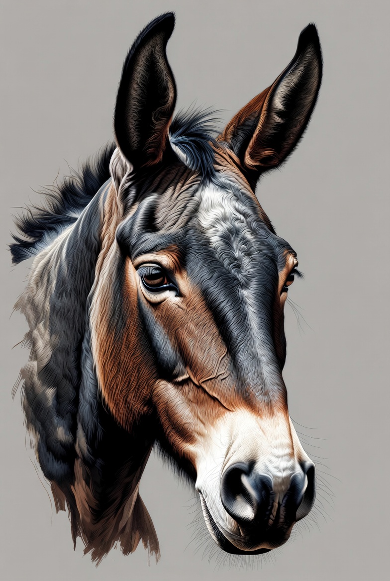 A detailed illustration of a donkey's head with large dark ears, brown and black mane, and expressive eyes. The donkey faces forward against a plain gray background. Its muzzle features white markings and soft fur texture.
