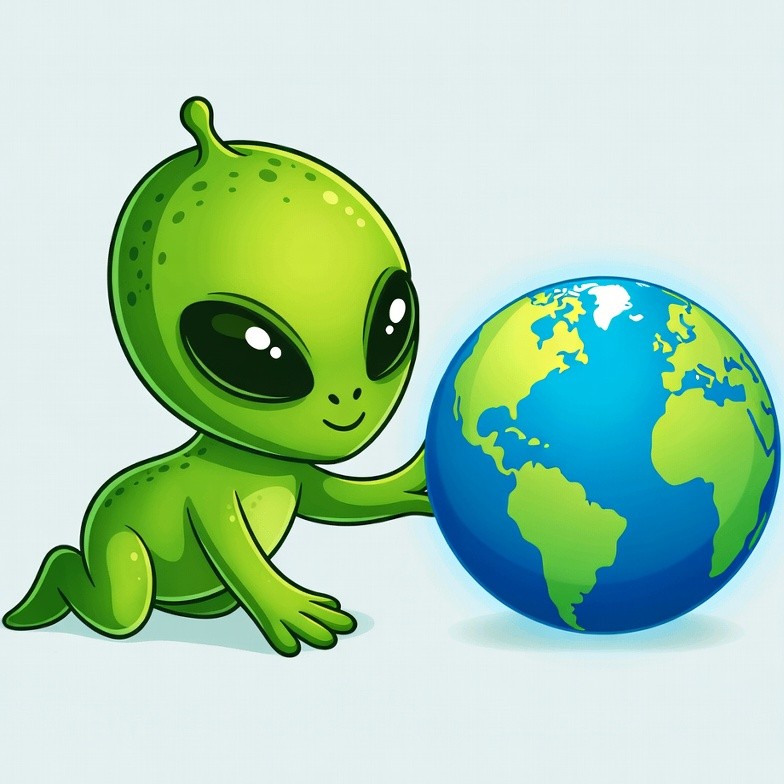 A cute cartoon green alien with large black eyes sits on a white background, gently holding a detailed globe of Earth in its hands. The alien has a friendly smile and small antennae. The illustration features vibrant colors and an isolated background.