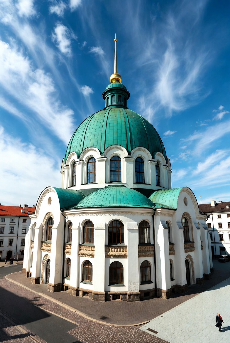 A striking Orthodox church features a large green dome topped with a golden spire and white walls with arched windows. Surrounding buildings and a cobblestone street are visible in the foreground under a blue sky with scattered clouds. A single person walks nearby on the pavement.