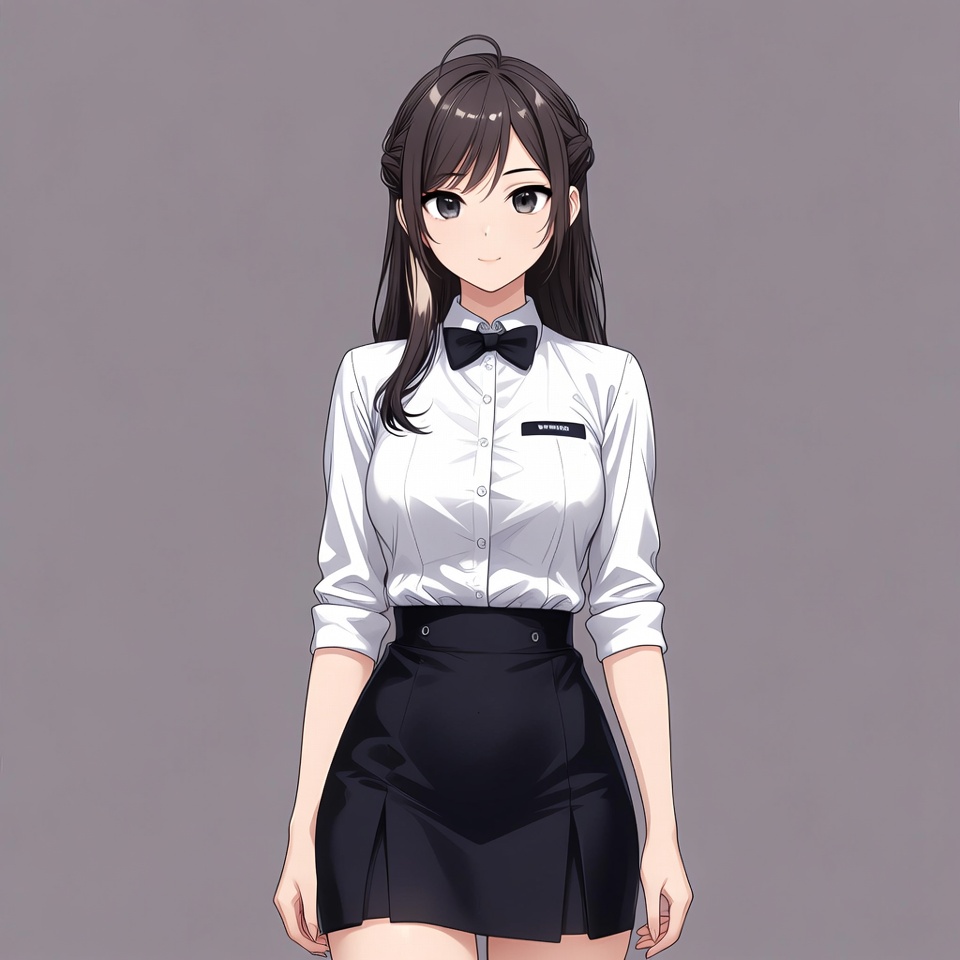Asian, black bow tie, black skirt, brown hair, cute anime, female, gray background, illustration, large eyes, long hair, manga style, name tag, pleated skirt, ponytail, school uniform, smiling, standing, white shirt, anime girl
