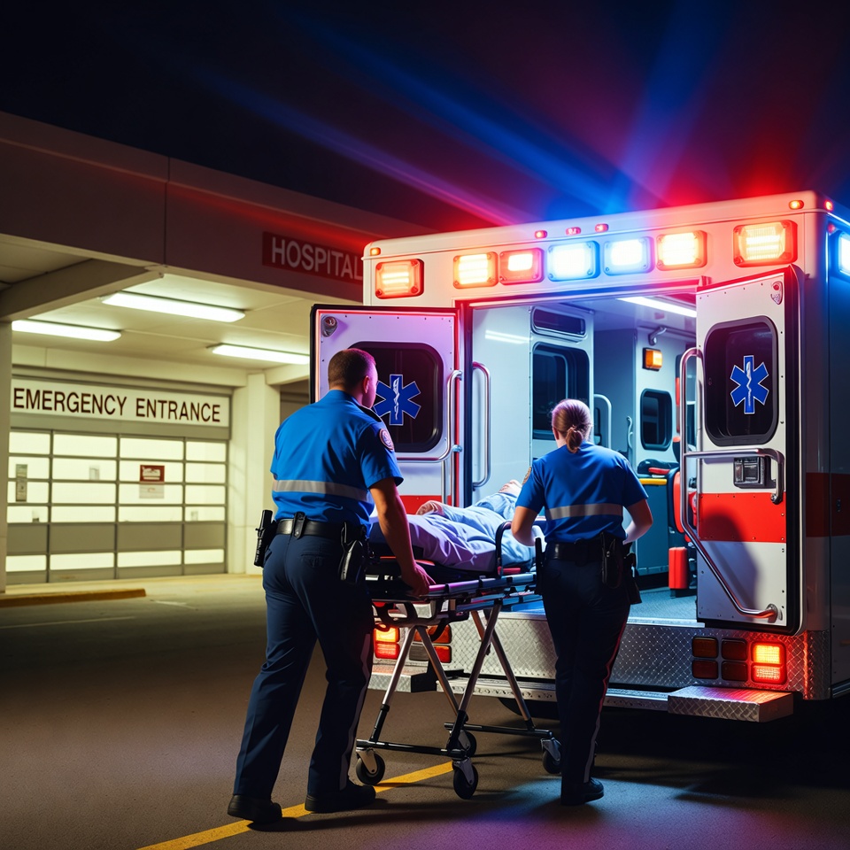 Two paramedics in blue uniforms push a stretcher with a patient toward the emergency entrance of a hospital at night. An ambulance with flashing red and blue lights is parked nearby with its doors open. The scene is illuminated by the ambulance lights and hospital signage.