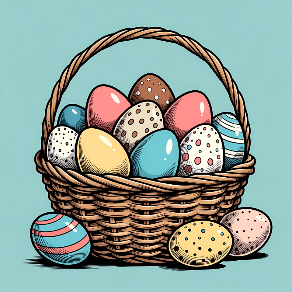 Easter basket, basket handle, blue eggs, brown eggs, clipart, colorful eggs, egg patterns, hand drawn, holiday eggs, illustration, isolated background, pastel colors, pink eggs, polka dot eggs, spring decoration, striped eggs, vibrant eggs, wicker basket, yellow eggs, Easter eggs
