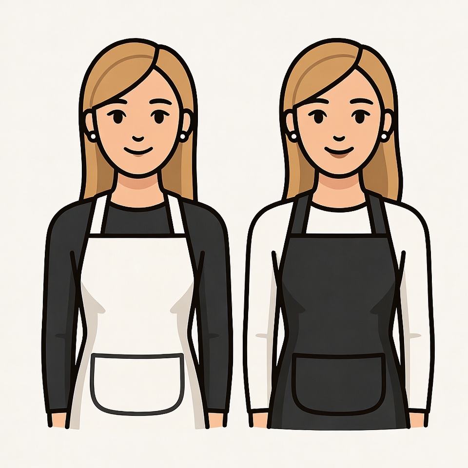 Two identical cartoon women with long blonde hair stand side by side on a white background. One wears a white apron over a black top, while the other wears a black apron over a white top. Both have cheerful expressions and small earrings.