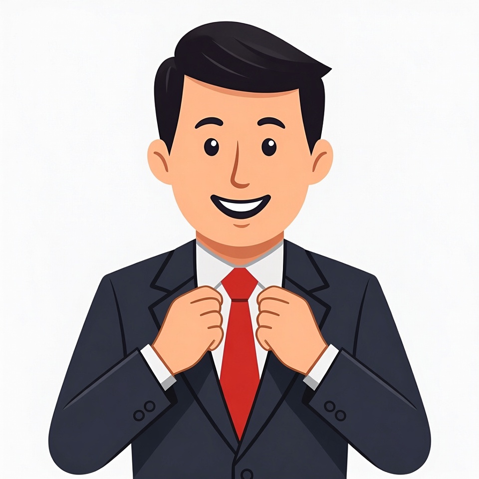 A cartoon man with short black hair smiles while adjusting his red tie. He wears a dark suit with a white shirt and stands against a white background. His hands are positioned on the knot of the tie.