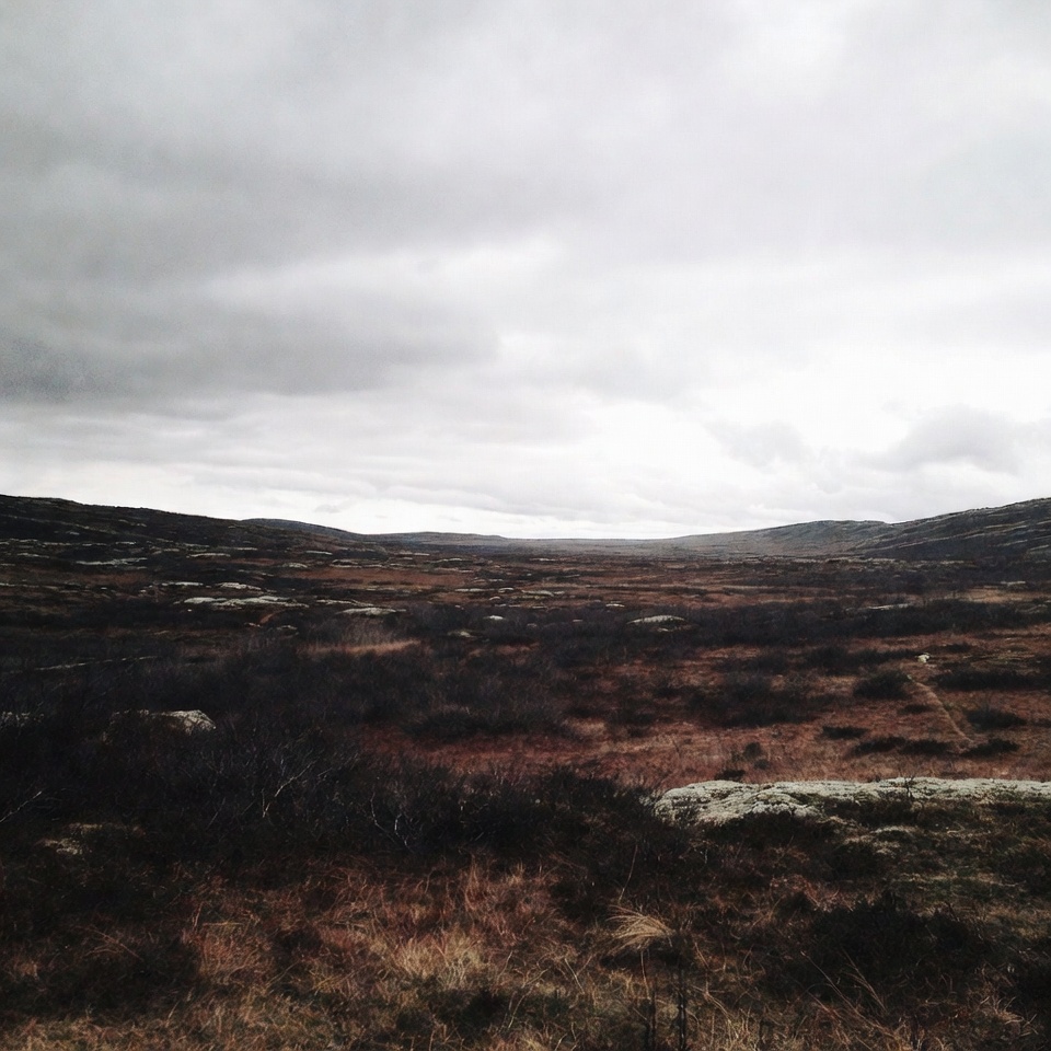 A vast tundra landscape stretches under a cloudy gray sky. Brown grasses and shrubs cover the foreground with scattered rocks. Distant rolling hills fade into the horizon.