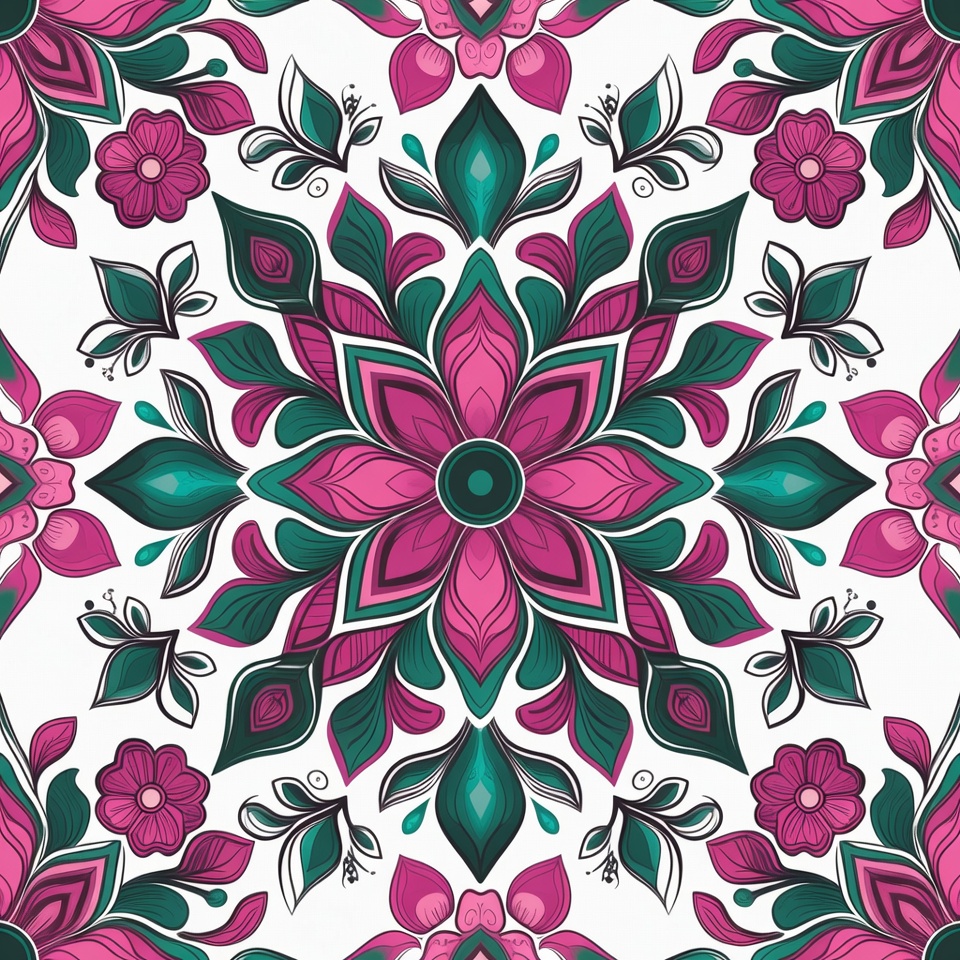 A seamless vector illustration features large central pink flowers with green leaves and stems on a white background. Delicate pink blooms and green foliage create an intricate, repeating floral design. The pattern includes detailed petals and leaves in vibrant magenta and teal tones.
