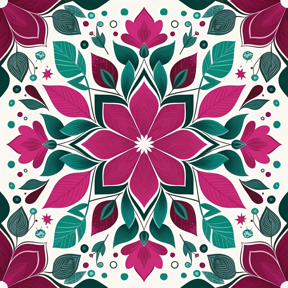 abstract flower, botanical art, clipart flower, decorative flowers, digital illustration, floral design, floral graphic, floral pattern, flower illustration, green foliage, green leaves, isolated flower, leaf patterns, magenta petals, pink blooms, teal accents, vector art, vibrant flowers, white background, pink flower