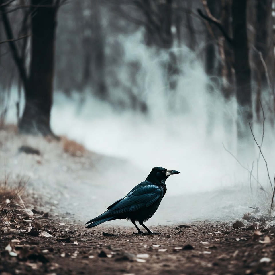 atmospheric, autumn forest, bare trees, bird, black bird, crow, dark, eerie forest, fog, forest, mist, nature, path, smoky fog, standing bird, trail, trees, wildlife, woods, yellow beak, raven