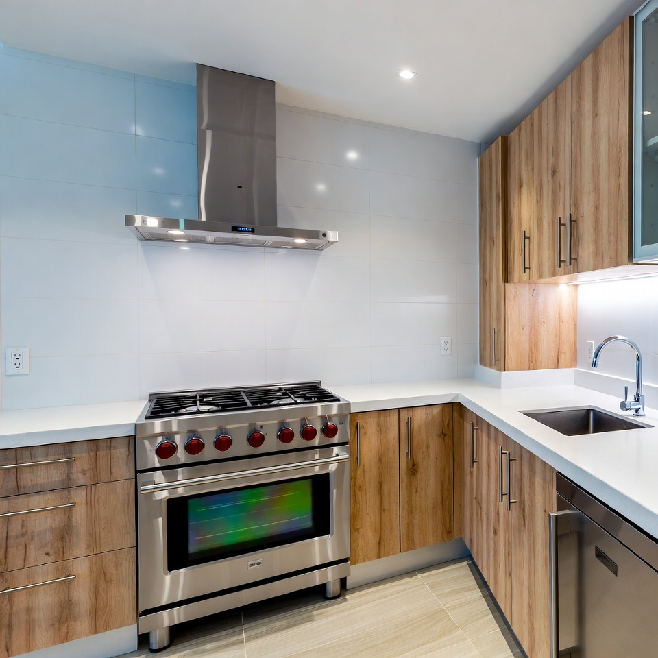 blue wall, contemporary design, cooking appliances, corner kitchen, dishwasher, gas range, gas stove, home interior, kitchen hood, luxury kitchen, modern kitchen, oven, range hood, recessed lights, red stove, sink, stainless steel, white countertop, wood cabinets, wooden cabinets, kitchen