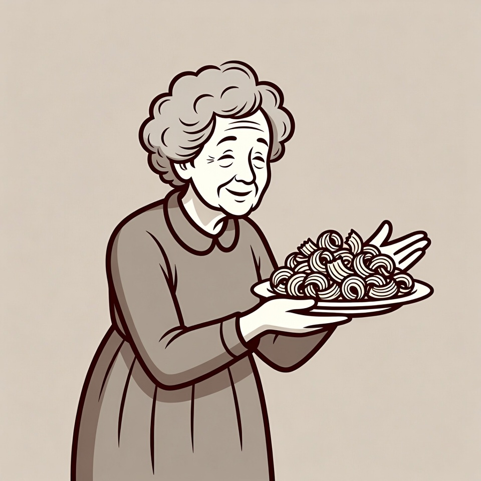 An illustration of a smiling elderly woman with curly gray hair holds a white plate filled with spiral pasta. She wears a long-sleeved brown dress with a white collar and stands against a beige background. Her expression is joyful as she presents the pasta with both hands.