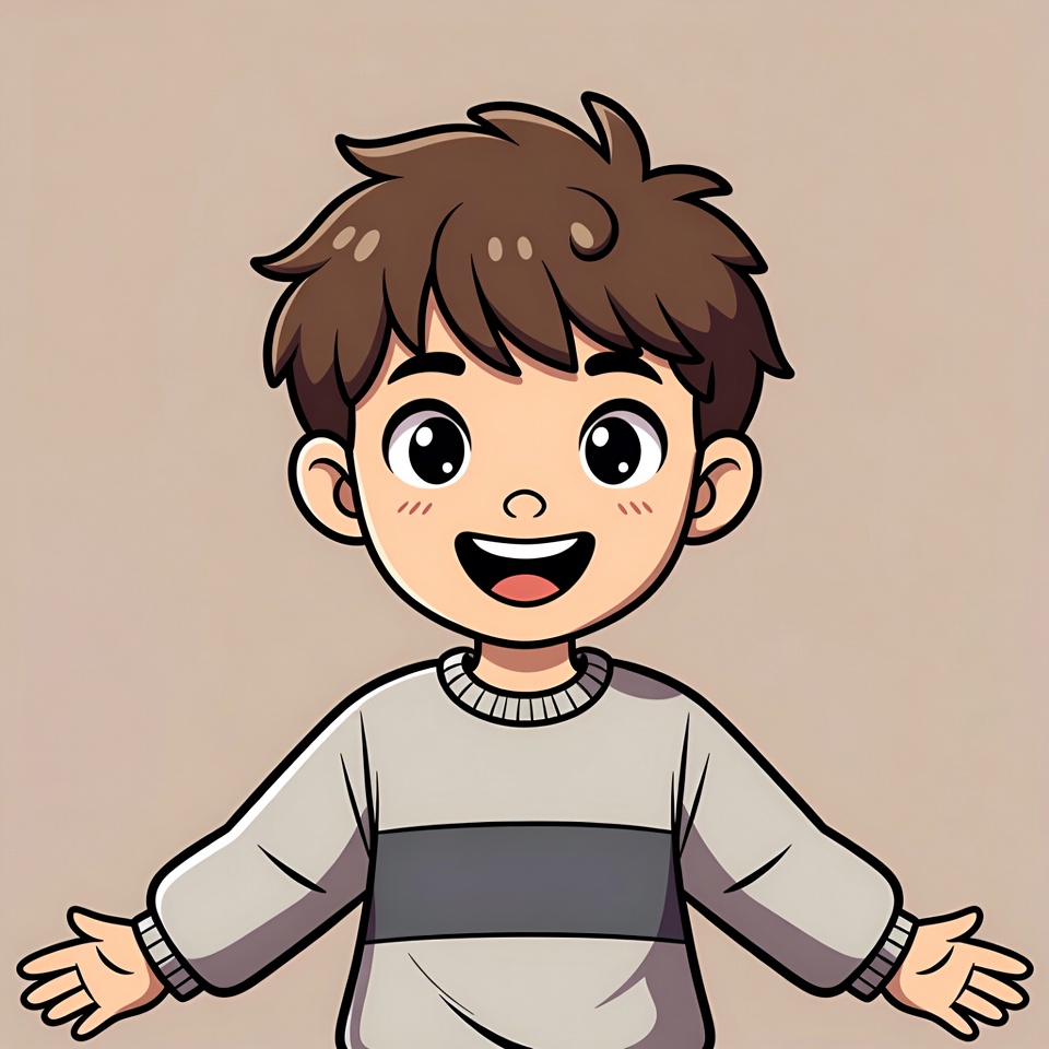 A cute cartoon boy with spiky brown hair smiles widely with sparkling eyes. He wears a gray sweater with a dark horizontal stripe across the chest. His arms are spread open wide against a plain beige background.