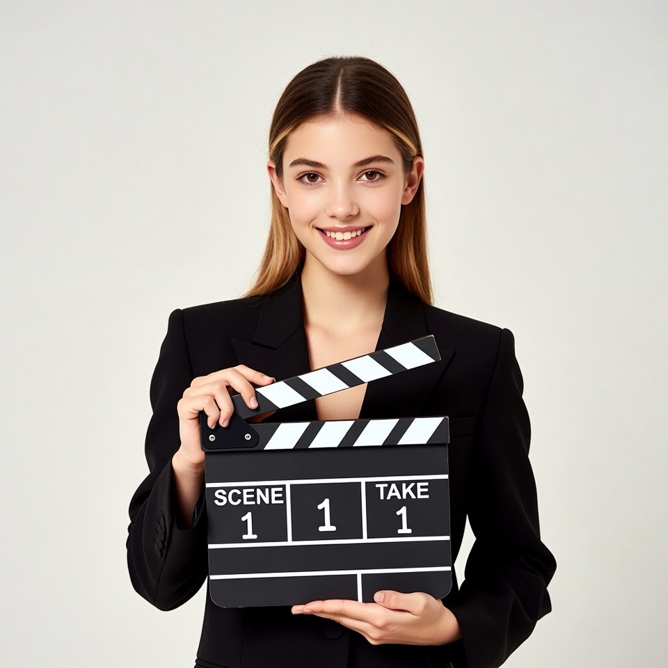 A young woman with long straight hair and a bright smile holds a black clapperboard marked 'Scene 1 Take 1' in front of her chest. She wears a formal black suit jacket and stands against a plain white background. Her expression is cheerful and professional.