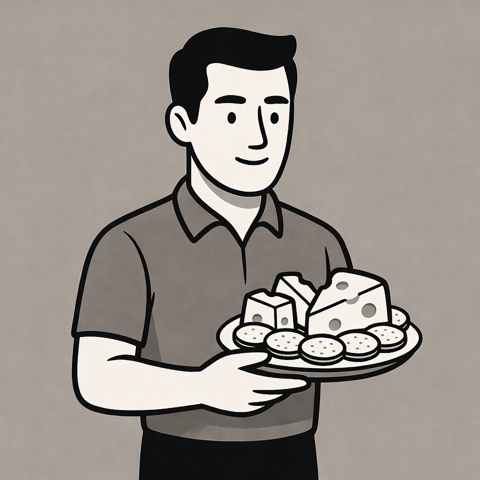 A cartoon man with short black hair smiles while holding a large platter of cheese cubes and round crackers. He wears a short-sleeved collared shirt and stands against a plain gray background. The illustration is in black line art with gray shading.
