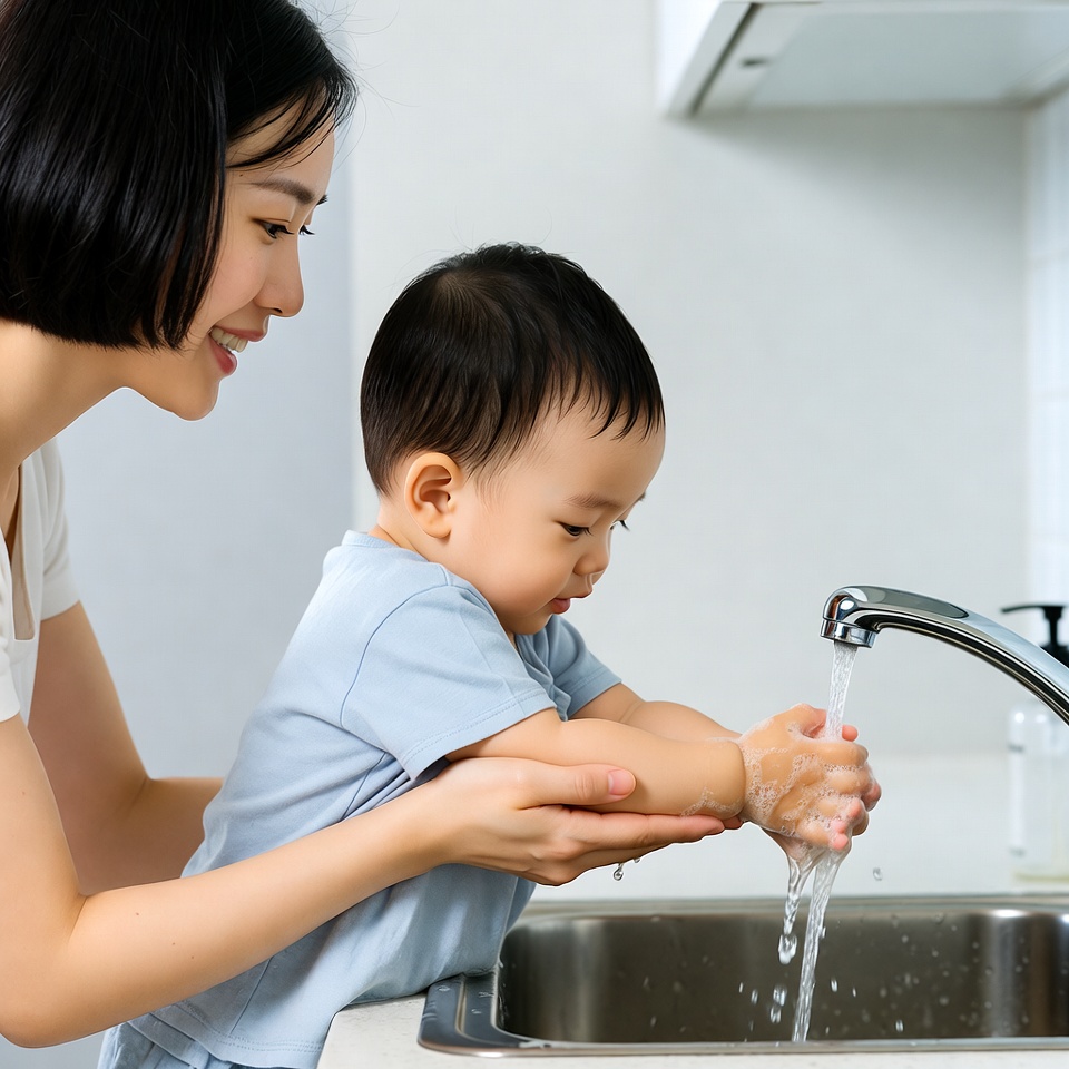 Asian mother helping baby wash hands