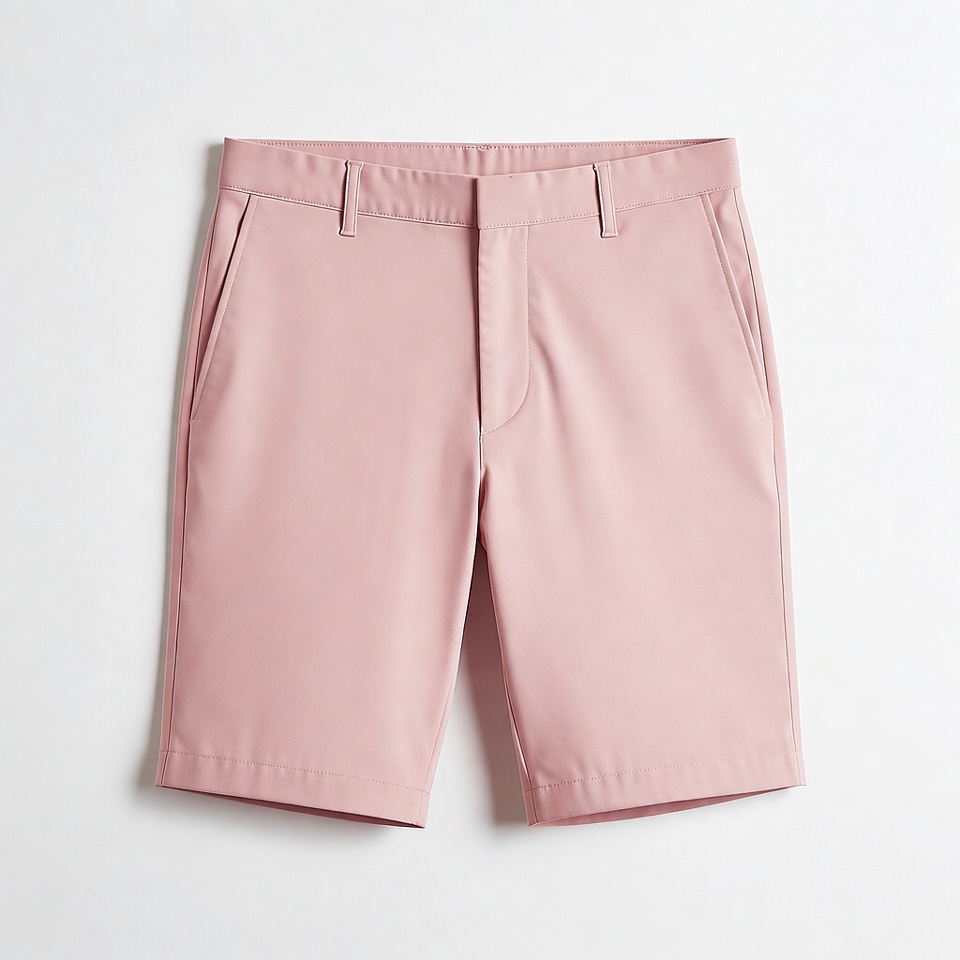 apparel, belt loops, casual wear, chino shorts, clothing, fashion, flat front, isolated background, light pink, men's shorts, side pockets, slim fit, summer shorts, white background, zipper fly, pink shorts