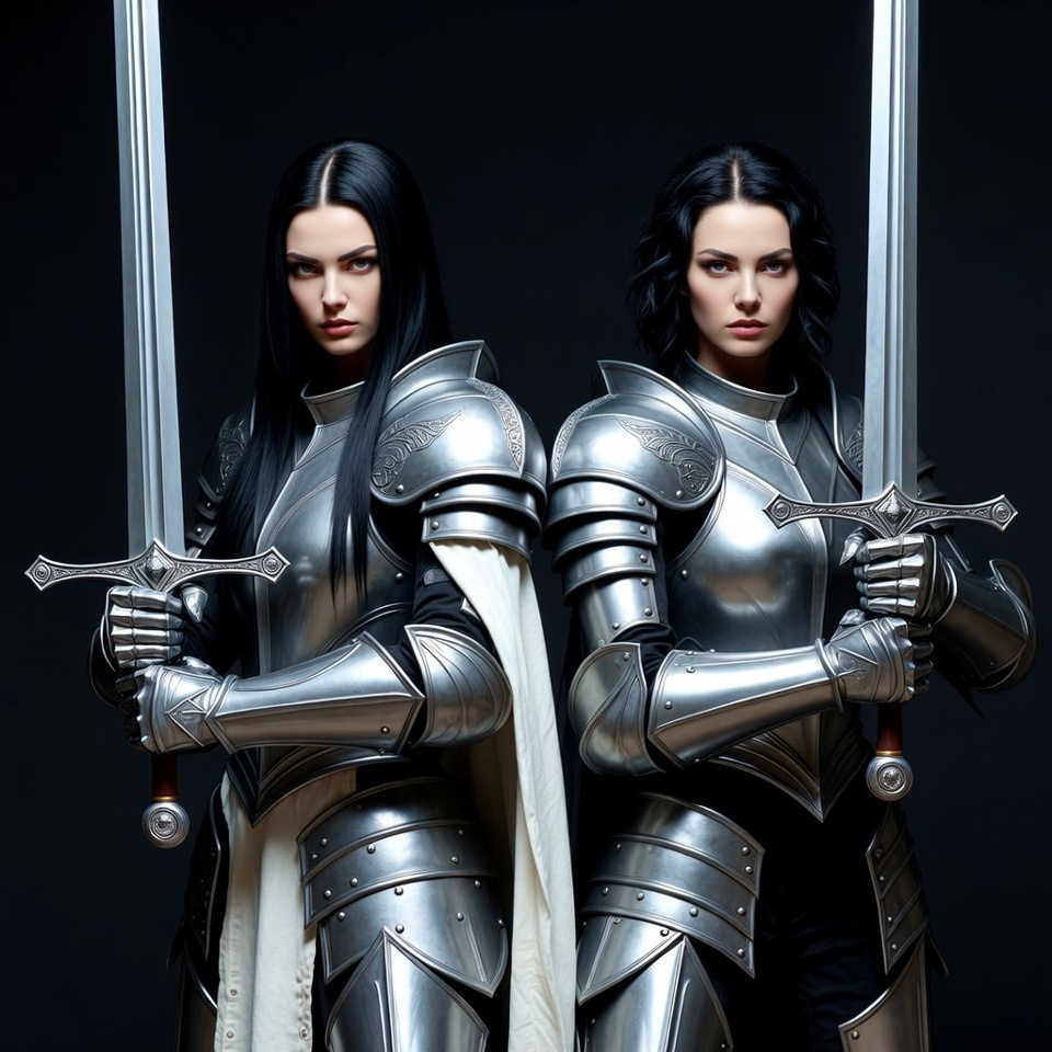 Two women with long black hair stand side by side wearing shiny silver medieval armor and white capes. They each grip large swords with both hands, posing powerfully against a dark background. Their expressions are intense and focused.